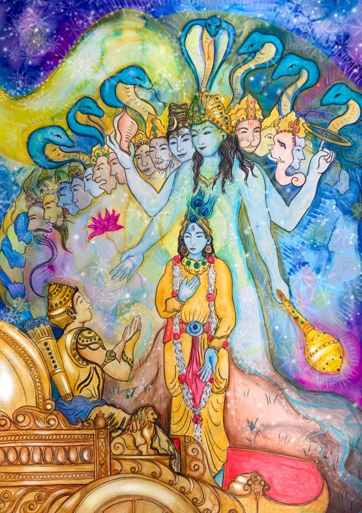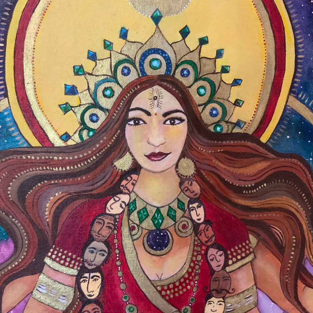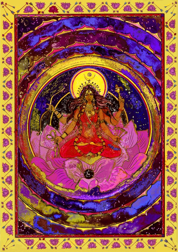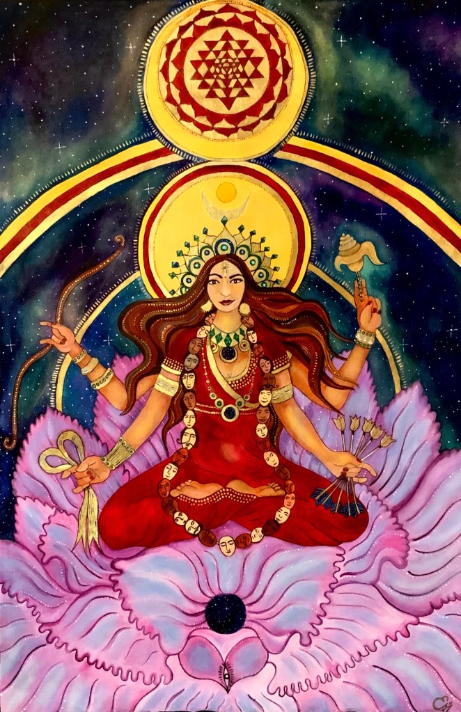 Bhairivi- the fierce one.Chinnamasta- destroyer of ego.Bhuvaneshwari- she who shines so bright – all darkness dissolves in her presence. Kali- ferocious Mother of love. Dhumavati- teacher of supreme detachment. Bagalamukhi- silence your tongue to gossip & untruth!Matangi- embodiment of wild creativity & connection to the natural world.Tantric Tara- reminds us of the power of our words. Words are spells- speak wisely. Lalita Tripura Sundari – embodiment of abundance in all directions. All desires fulfilled. Jai Ma! Kamala (tantric Lakshmi)Lalita Tripura Sundari painting . Acrylic on canvas. Ganesha & Mooshak the rat.Krishna reveals his true nature to Arjuna.