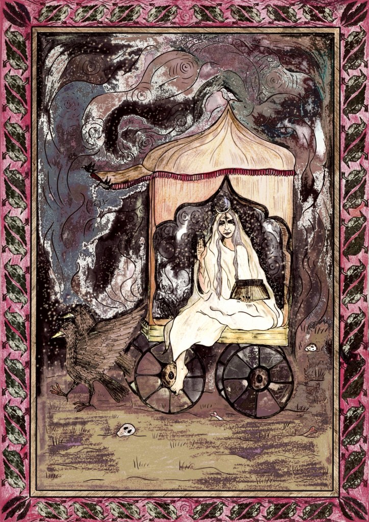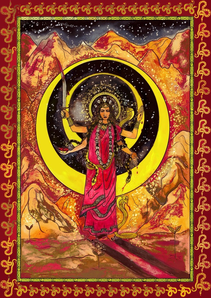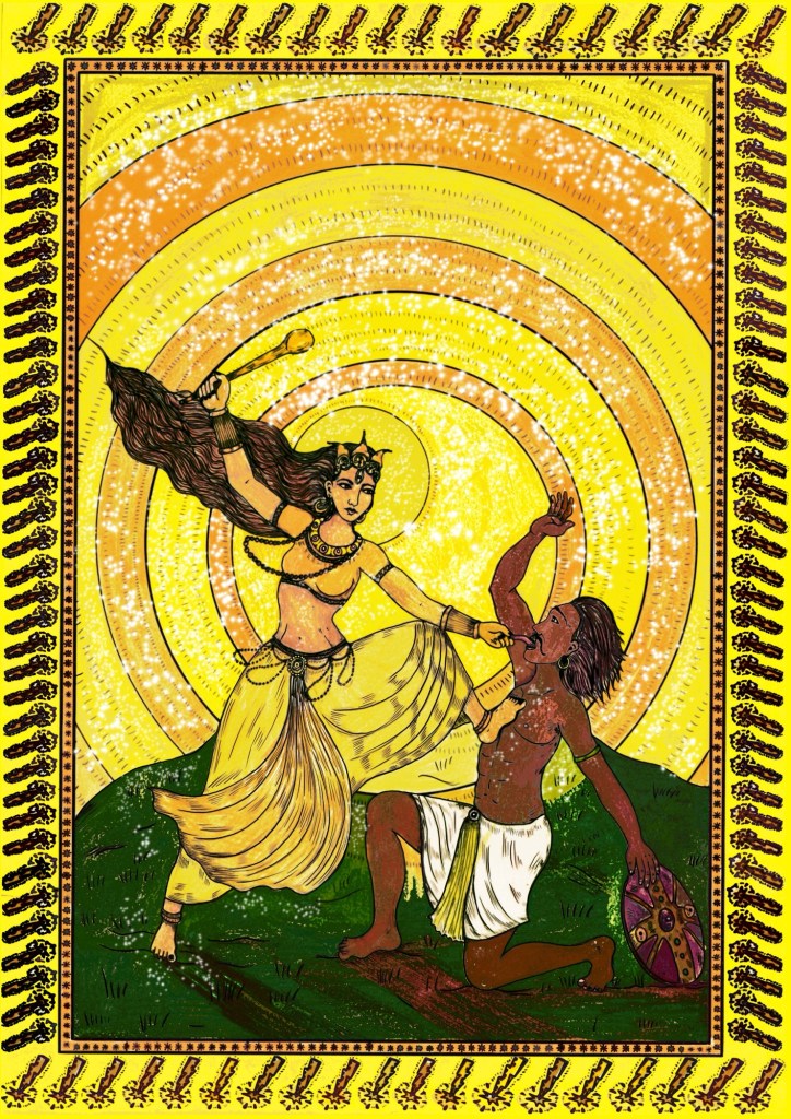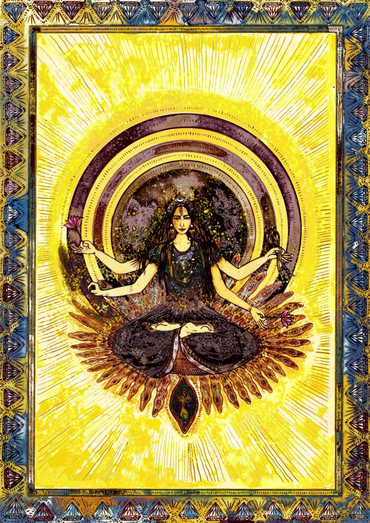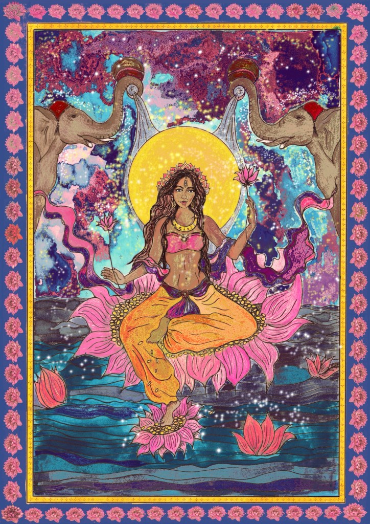Bhairivi- the fierce one.Chinnamasta- destroyer of ego.Bhuvaneshwari- she who shines so bright – all darkness dissolves in her presence. Kali- ferocious Mother of love. Dhumavati- teacher of supreme detachment. Bagalamukhi- silence your tongue to gossip & untruth!Matangi- embodiment of wild creativity & connection to the natural world.Tantric Tara- reminds us of the power of our words. Words are spells- speak wisely. Lalita Tripura Sundari – embodiment of abundance in all directions. All desires fulfilled. Jai Ma! Kamala (tantric Lakshmi)Lalita Tripura Sundari painting . Acrylic on canvas. Ganesha & Mooshak the rat.Krishna reveals his true nature to Arjuna.